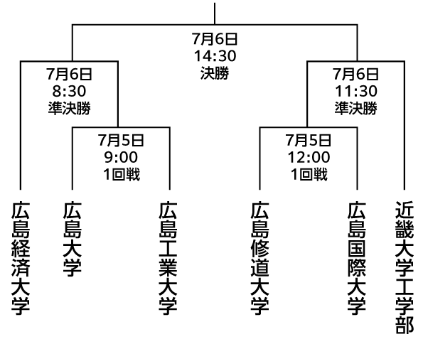 | 7月5日(土)9:00~ | 広島工業大学 VS 広島大学 | 7 - 8 | 広島修道大学 (野球場) |